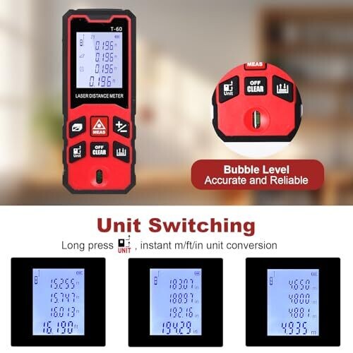 • Switch effortlessly between m, ft, and in units and enjoy smart features like auto shut-off after 2 minutes of inactivity for extended battery life on the job.