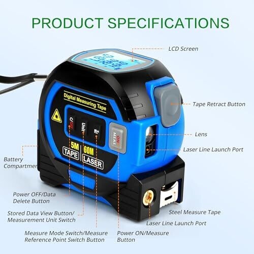 - Meet the ultimate all-in-one measuring tool designed for speed, accuracy, and versatility on any project. A long-range laser distance feature combined with a durable physical tape ensures you can tackle tasks quickly—from large-scale layouts to precise edge measurements.