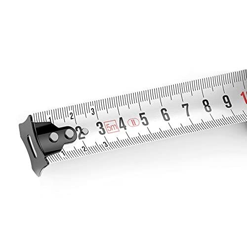 5 m coated manganese steel tape supports short-range measurement with a ruler hook, and provides imperial and metric scales.