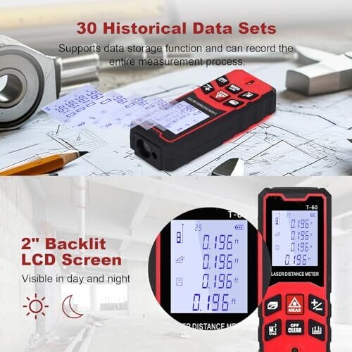 • See measurements clearly on a bright, backlit LCD display and access up to 30 historic data sets with one-touch memory recall for quick floor plans and material calculations.