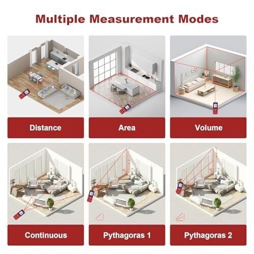 • Versatile measurement modes include distance, area, and volume, plus continuous and Pythagorean measurements with additive/subtractive calculations for precise material estimates.