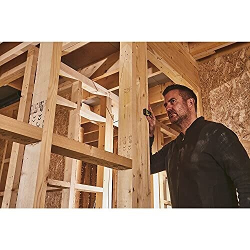 Stanley pocket laser distance measure provides quick 12-meter range with precise one-button operation. Compact, handheld tool features bright yellow/black casing, easy-to-read display, and pocket-ready design for interior and outdoor measurements, ideal for renovations, carpentry, and DIY projects.
