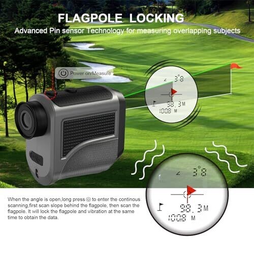 The device includes flag-seeking and target-lock features with a vibration alert to confirm when the flag or target is secured, aiding measurement reliability during play.