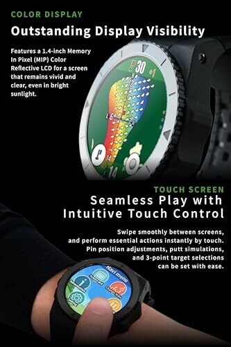 1.4-inch Full-Color Touchscreen Display; Vertical and horizontal swipe support for on-course operation; M10 GPS chip supporting GPS, QZSS/Michibiki, GLONASS, and Galileo for fast, accurate positioning; Dynamic Green Mapping automatically rotates the green view based on position with depth, width, front edge, and center distance indicators; Slope Direction Indicator to assist with green slope interpretation; Temperature Compensation to adjust distance data for ambient temperature; Auto Measurement detects swings and records shot distances; Elevation-Corrected Distance calculating true distance by factoring elevation changes; Durable and portable design with protective case; Manufactured in Japan and assembled in an ISO 9001-certified facility.