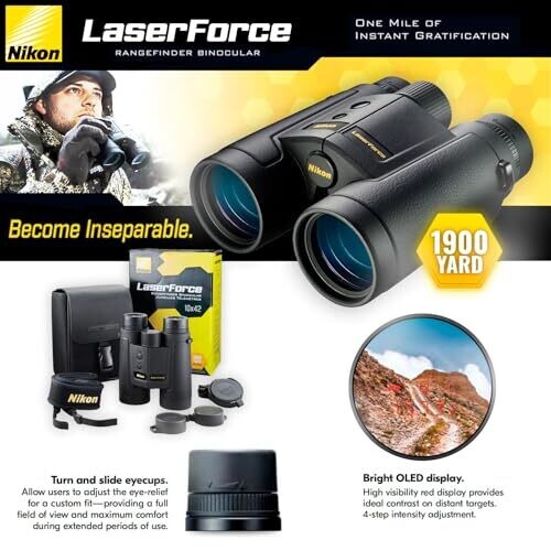 Nikon LaserForce combines built-in rangefinding with bright, clear imaging for all weather. Rugged, weatherproof construction and ergonomic eyecups ensure quick target distance reading and comfortable viewing, while a red OLED display provides adjustable brightness for varying light conditions.
