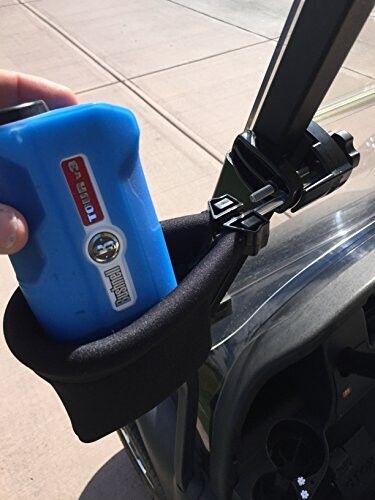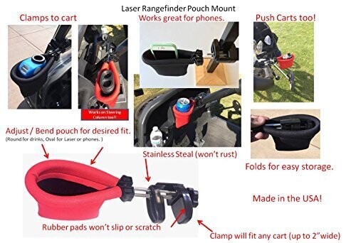 Soft neoprene keeps the rangefinder safe, secure and easy to find. Easily clamps to golf carts and push carts (no tools required). Clamping range up to 2" wide. Will clamp to most steering columns. Rubber clamping pads won't slip or scratch your golf cart. Adjustable to fit your rangefinder. Folds up for easy storage. Works great for all electronic devices (phones, GPS, golf tees).