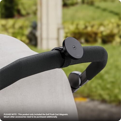 The product is a magnetic mount designed for golf push carts. It supports magnetic accessories including a rangefinder, mobile devices with magnetic cases, towel clips, cigar holders, and head covers (sold separately). It uses high-performance magnets to secure accessories to the cart handle during use. The mount is constructed from wear-resistant materials intended to withstand weather exposure over multiple seasons. It is compatible with push carts from various brands, including Clicgear, Bag Boy, Big Max, Tour Trek, Sun Mountain, and Rovic, providing a universal fit on the handle of golf push carts.